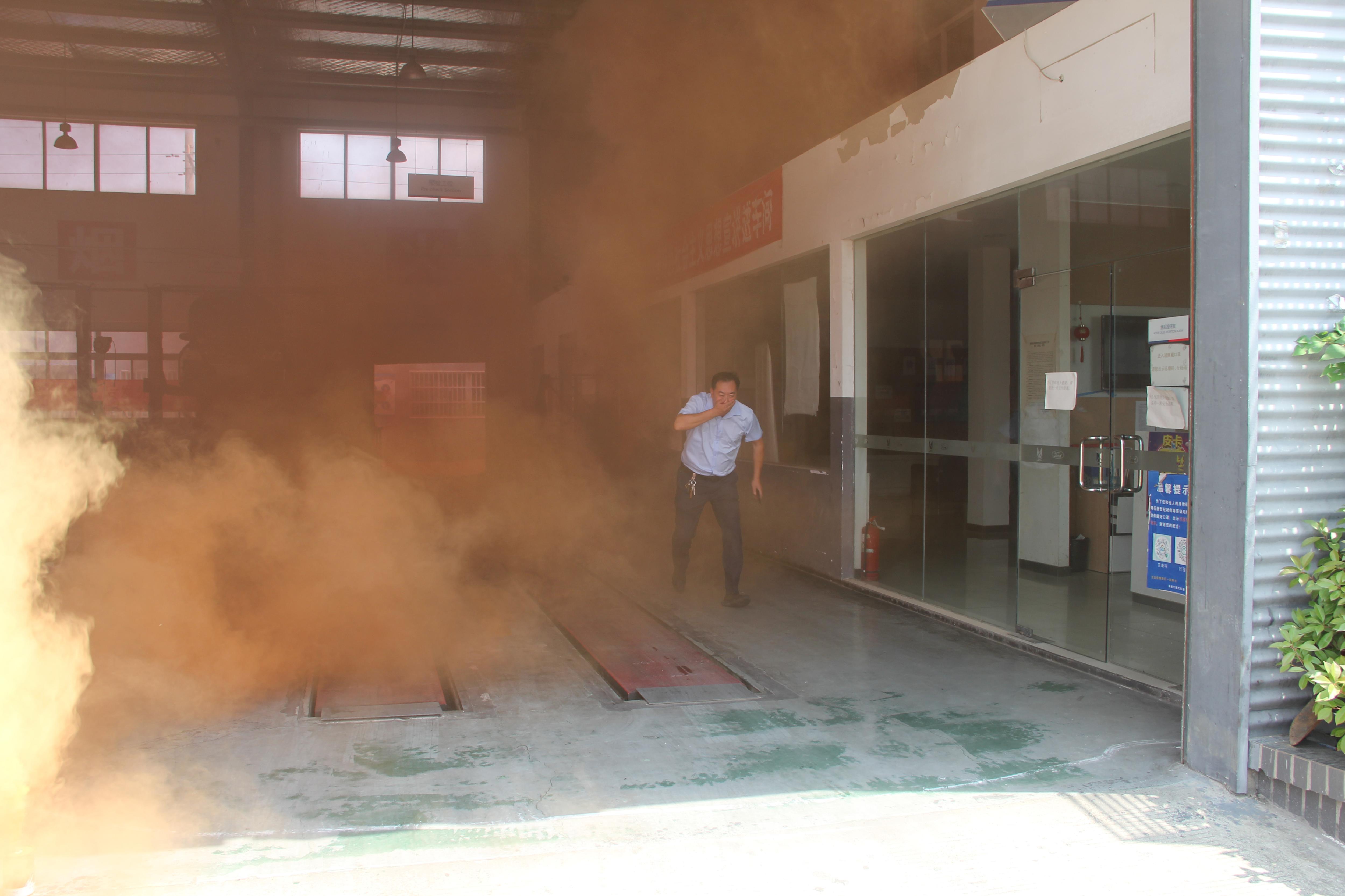 演练中,随着一声“演习开始”,安管人员立即对江铃修理车间、客户服务区域、办公区域人员进行紧急疏散并要求大家往车间出口处跑。当看到有浓浓的烟雾后,大家迅速有序往出口处跑去,通过大家协调配合和快速反应,所有人员都紧急撤离到安全区域,活动演练达到了预期效果。