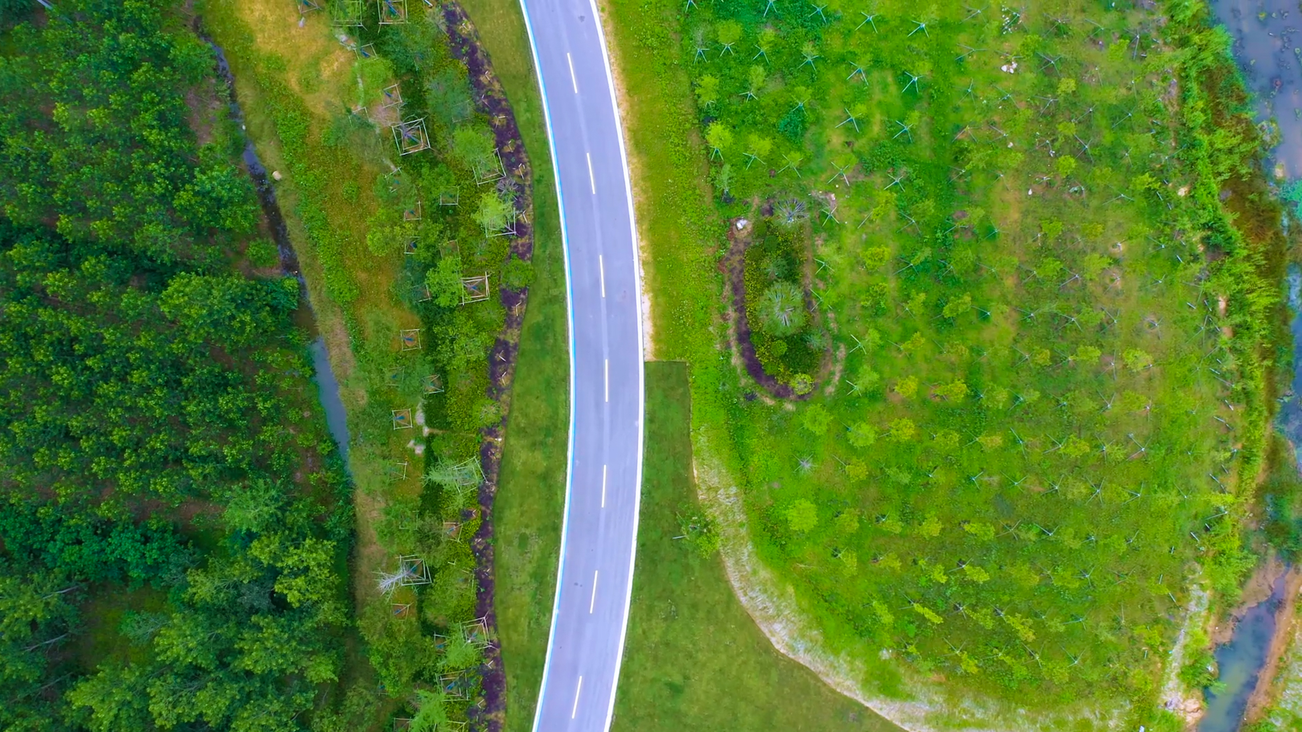 石梁河水库综合整治前,库区砂石路颠簸不平、坎坷泥泞、重车穿梭、漫天扬尘。如今的石梁河水库,坦途已成,畅行无碍。高空俯瞰,环湖道路将石梁河水库温柔环抱,成为水体的坚强依靠。线形良好、边坡坚实、边线顺直的环湖道路,中心采用黄虚线,两边分别设置白实线+彩色标线,让鲜明成为生态道路的关键词。三座新建桥梁,优美流畅的设计与周边环境景观高度融合。环湖道路全线刚柔并济、明艳大气,是湖光水色外的辅助风景线。