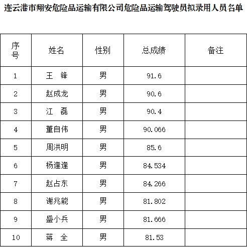 根据连云港市翔安危险品运输有限公司危险品运输驾驶员员招聘公告有关规定和要求,现将本次招聘拟录用人员名单予以公示。 公示时间:2024年12月4日至12月10日。